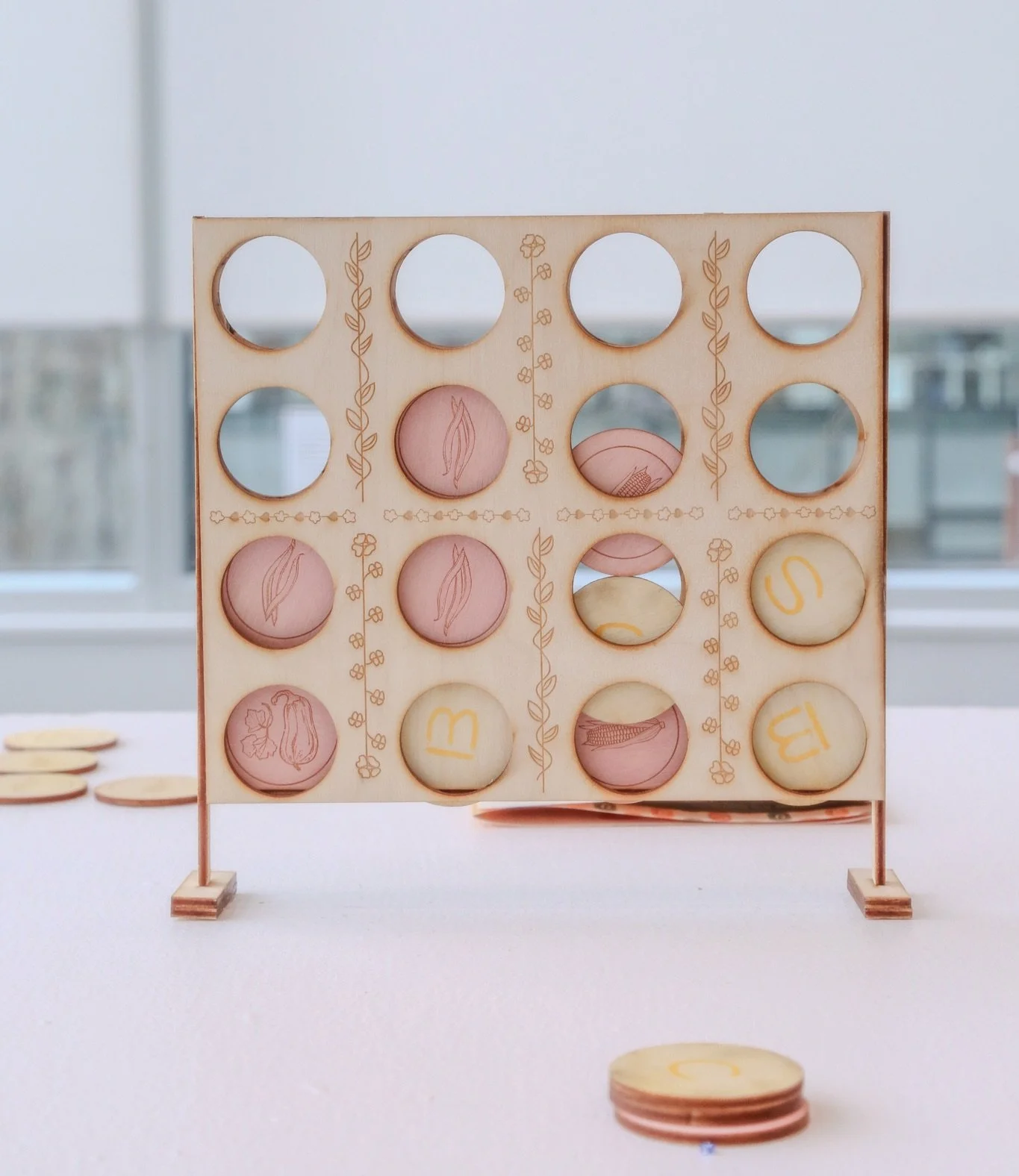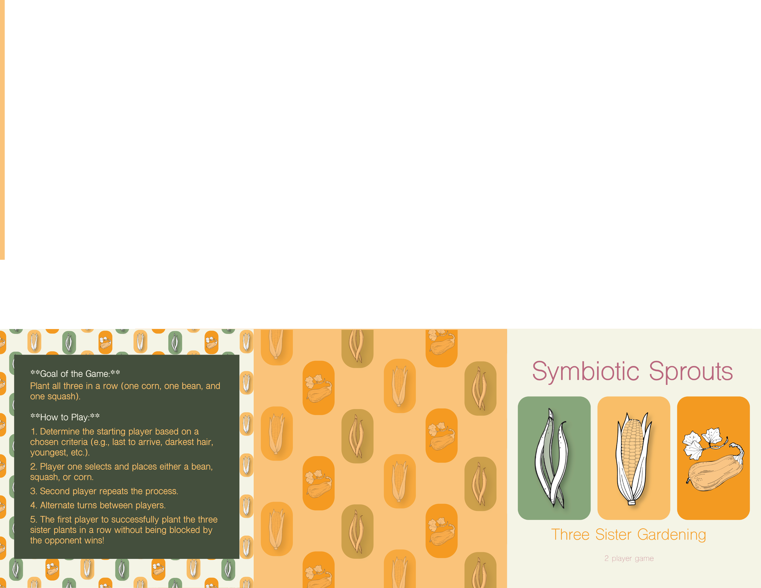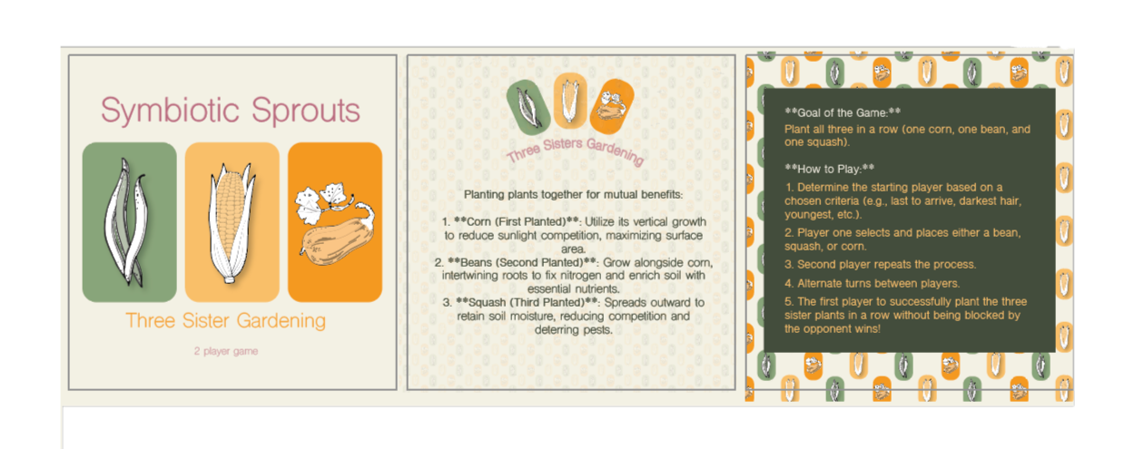 This project explores the intersection of woodworking and indigenous practices. Inspired by Three Sisters gardening, a traditional practice common in Indigenous cultures of the region, the game is designed to educate players about the planting method, its interdependent crops, and its cultural significance. The game pieces are stained with natural, land-based materials such as beets and turmeric, reflecting sustainable practices and a connection to the land. Through this project, the design emphasizes hands-on interaction, storytelling, and material experimentation, creating an engaging and meaningful experience that blends craft, culture, and education.